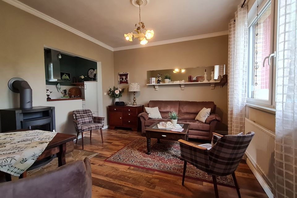 Innen ist das Haus im modernen Landhausstil eingerichtet – harmonisch abgestimmte Farben schaffen eine entspannte Atmosphäre, in der man schnell zur Ruhe kommt. Das Wohnzimmer (16 m²) lädt zum Verweilen ein – an kühleren Tagen sorgt ein Kaminofen für wohlige Wärme, zusätzlich ist elektrische Heizung vorhanden. Zur Unterhaltung gibt es einen Fernseher, ein CD-Radio, Bücher und Spiele für Groß und Klein.